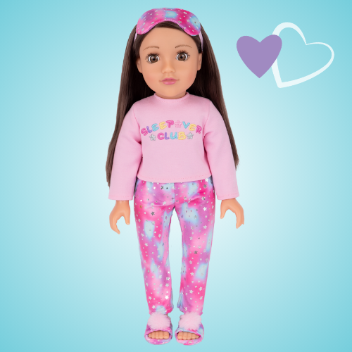 Wears cosy 'Sleepover Club' pyjamas, fluffy rainbow pom-pom slippers, and a matching eye mask for the sweetest dreams.